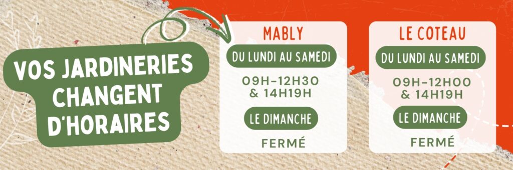 Vos jardineries de Mably et du Coteau vous accueillent du lundi au samedi ! Horaires du lundi au samedi :